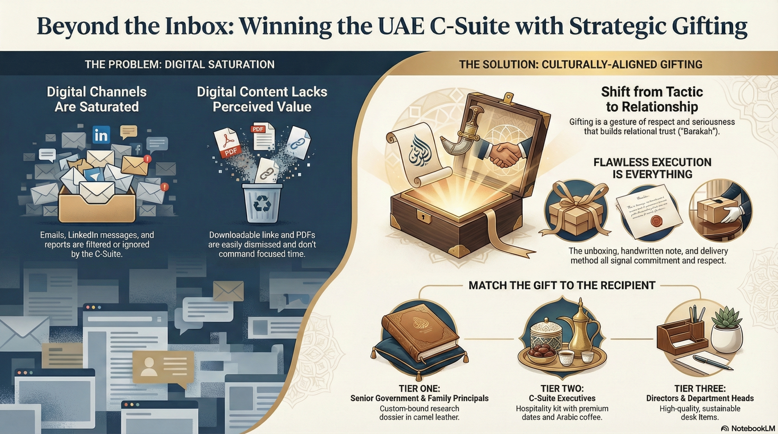 In the UAE, senior executives are saturated with digital communication. Email, LinkedIn messages, and downloadable reports compete for attention in an environment where most outreach is filtered or ignored.